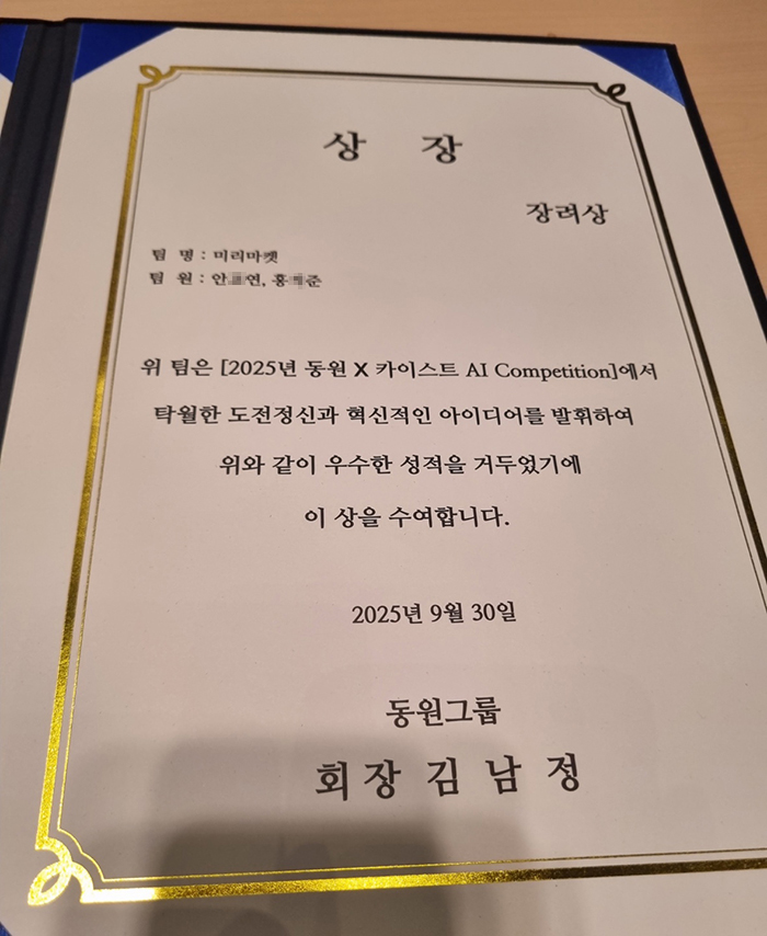'2025 동원 X 카이스트 AI 경진대회' 장려상 수상